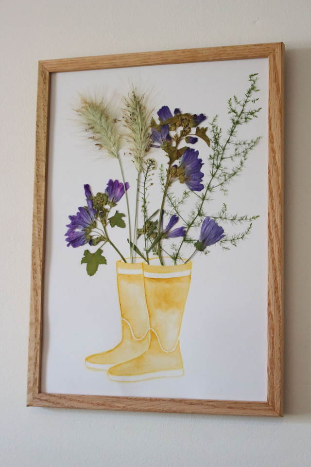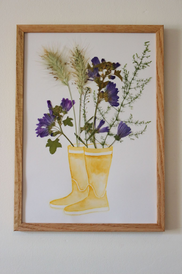 Cet herbier résulte d'une collaboration avec Elise qui a réalisé l'aquarelle. Il a été réalisé avec des fleurs françaises récoltées lors de mes ballades et séchées dans mon atelier.