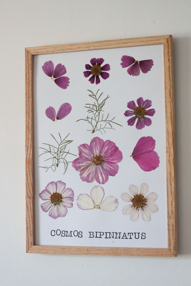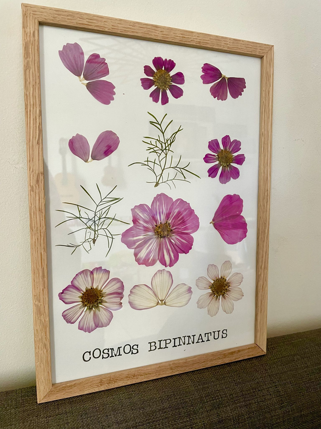 Cet herbier a été réalisé avec des fleurs françaises de comos récoltées lors de mes ballades et séchées dans mon atelier.